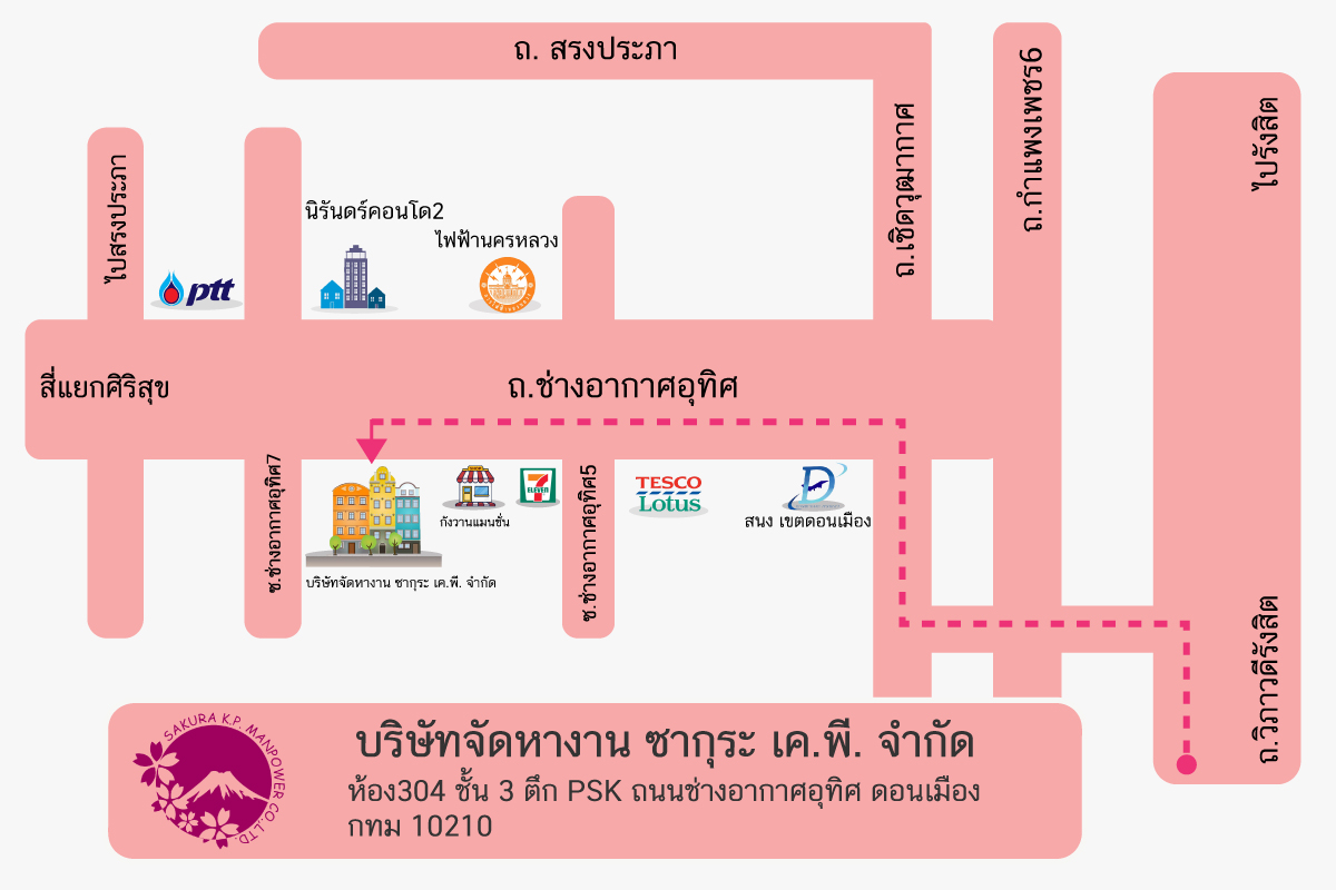 บริษัทจัดหางานซากุระ เค.พี. จำกัด ใบอนุญาตเลขที่ ต.1212/2561 สำนักงานตั้งอยู่ที่ 349 ถนนช่างอากาศอุทิศ แขวงดอนเมือง เขตดอนเมือง กรุงเทพมหานคร 10210